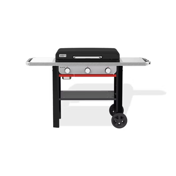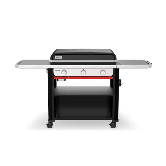 Step up to a premium flat-top grilling experience with the sleek and stylish 28” Slate® Rust-Resistant Griddle. Start sizzling fajitas, smashing burgers, and stir-frying right out of the box on the pre-seasoned carbon-steel cooktop that stays ready, not rusty, use after use. This griddle quickly reaches over 500ºF and provides even heat across the surface. Wind guards prevent the burners from blowing out, and the cooktop is set close to the burners to keep the temperature steady. Three precision-control burners allow for multi-zone heat, so you can cook perfect pancakes on low and crisp up bacon on high all on the same cooktop. No use of coatings means you can use metal tools to flip, press, and scrape without worry. Plus, the side table rails are compatible with Weber Works™ snap-on accessories, so you can keep cooking and cleaning supplies within reach (accessories sold separately).