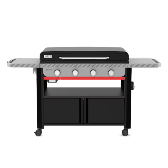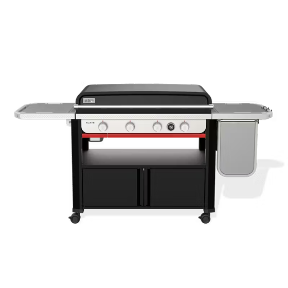 Step up to a premium flat-top grilling experience with the sleek and stylish Slate® 36” Rust-Resistant Griddle with closed cabinet for convenient storage. Start sizzling fajitas, smashing burgers, and stir-frying right out of the box on the pre-seasoned carbon-steel cooktop that stays ready, not rusty, use after use. This griddle quickly reaches over 500ºF and provides even heat across the surface. Wind guards prevent the burners from blowing out, and the cooktop is set close to the burners to keep the temperature steady. Four independently controlled burners allow for multi-zone heat, so you can cook perfect pancakes on low and crisp up bacon on high all on the same cooktop. No use of coatings means you can use metal tools to flip, press, and scrape without worry. Keep your griddle gear near with a variety of accessories that snap onto Weber Works™ side rails. The left side table folds down to save space when you’re done.